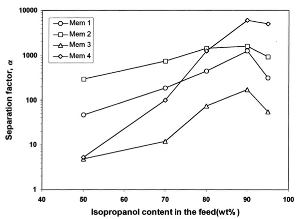 林欣仪 (2013) 氧化石墨烯复合薄膜应用于渗透蒸发分离程序分离 70 wt% 异丙醇水溶液具有良好之分离效能。在 30℃ 操作温度下,其透过端水浓度大于 99.5wt%,透过量达 2,047 g╱m2h,且随着沉积量增加,透过量及选择性皆不受影响。在高温 70℃ 进料环境下进行渗透蒸发操作,依然能维持大于 99.5wt% 之透过效能且透过量为 4,137 g╱m2h。