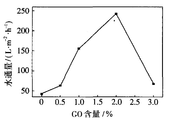 然而,PS 超滤膜亲水性和抗污染性能较差,在实际应用中容易被污染,使膜通量下降,导致膜的使用寿命降低.为此,人们在膜材料中引入无机纳米颗粒,如 A12O3、TiO2、SiO2、ZrO2 及碳纳米管等,以改善复合膜的亲水性、强度、硬度及渗透性和抗污染性等性能。氧化石墨烯(GO) 是一种新型的无机纳米材料,含有丰富的含氧官能团,亲水性好,化学性质稳定,机械强度高,而且具有一定的抗菌性,且原材料价格低廉,制备工艺简单 ,这些特性使其受到研究者们的青睐。