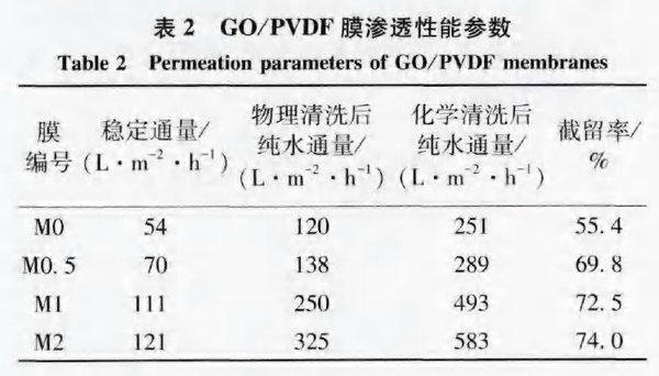 洪金成 (2015) 以氧化石墨烯掺杂聚偏氟乙烯制备的GO/PVDF平板膜为研究对象,研究膜的过滤特性和过滤阻力分布,并考察不同孔径的膜对造纸废水的处理效果。结果表明:随着GO掺量的增大,膜的亲水性以及抗污染性增强,膜的热稳定性增强。添加2% GO 的膜的接触角为 63.1°,纯水通量和牛血清蛋白 (BSA) 通量分别达到 595 和121 L/(in h),对 BSA 的截留率为 74%;BSA 溶液过滤过程中表面沉积阻力占主导,物理清洗后,膜的纯水通量恢复率低于 55%;化学清洗后,膜的纯水通量恢复率大于 96%。大孔径 (1 和 2 m) 膜处理造纸废水,因膜孔堵塞,通量迅速衰减,小孔径 (0.15、0.3 和 0.55 m) 膜的稳定通量随孔径的增大而增大。如表 2。