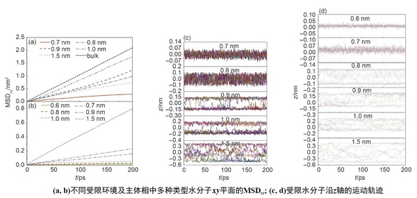 赵梦尧 (2015) 采用分子动力学模拟方法研究了原态石墨烯╱羟基改性石墨烯狭缝孔道中水分子的微观行为,模拟计算了水的界面结构性质和扩散动力学性质,所研究的石墨烯孔宽为 0.6–1.5 nm。模拟结果表明,在石墨烯狭缝孔道中,水分子受限结构呈现层状分布;在超微石墨烯孔道(0.6–0.8 nm)中水分子可形成特殊的环状有序结构,石墨烯表面可诱导产生特殊的水分子界面取向 。在石墨烯孔道中,水分子的扩散运动低于主体相水分子的扩散运动,羟基化石墨烯孔道可以促使水分子的扩散能力降低。对于改性石墨烯狭缝孔道,由于羟基的作用,水分子可以自发渗入 0.6 nm 的石墨烯孔道内。模拟所得到的受限水分子的动力学性质与水分子在石墨烯孔道内的有序结构有关。如示意图 6。