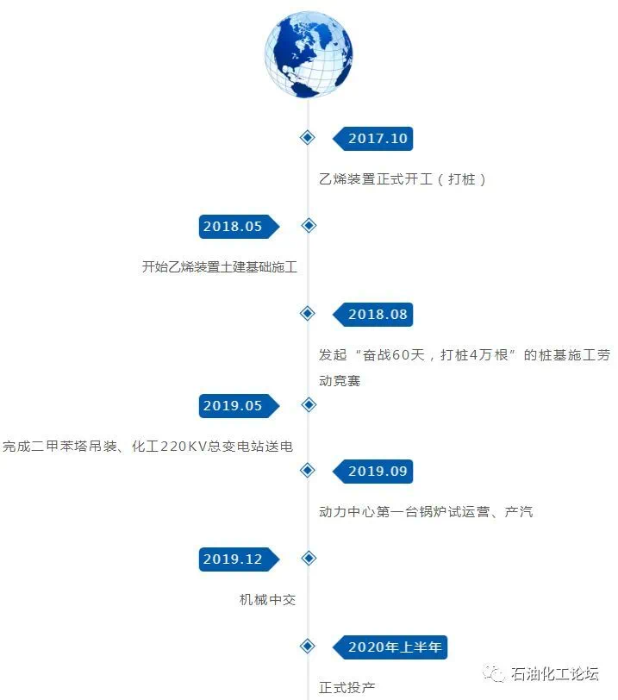项目的工艺装置及规模为化工部分装置11套,包括100万吨/年乙烯裂解装置、10万吨/年EVA装置、40万吨/年HDPE装置(Phillips双环管)、20/50万吨/年EO/EG装置、20/45万吨/年PO/SM装置、35万吨/年PP装置(Unipol)、12万吨/年丁二烯抽提装置、10/3万吨/年MTBE装置/丁烯-1装置、50万吨/年裂解汽油加氢装置、35万吨/年芳烃抽提装置、80万吨/年对二甲装置;炼油部分装置2套,包括新建300万吨/年常压蒸馏装置和45万吨/年炼厂干气预精制装置。