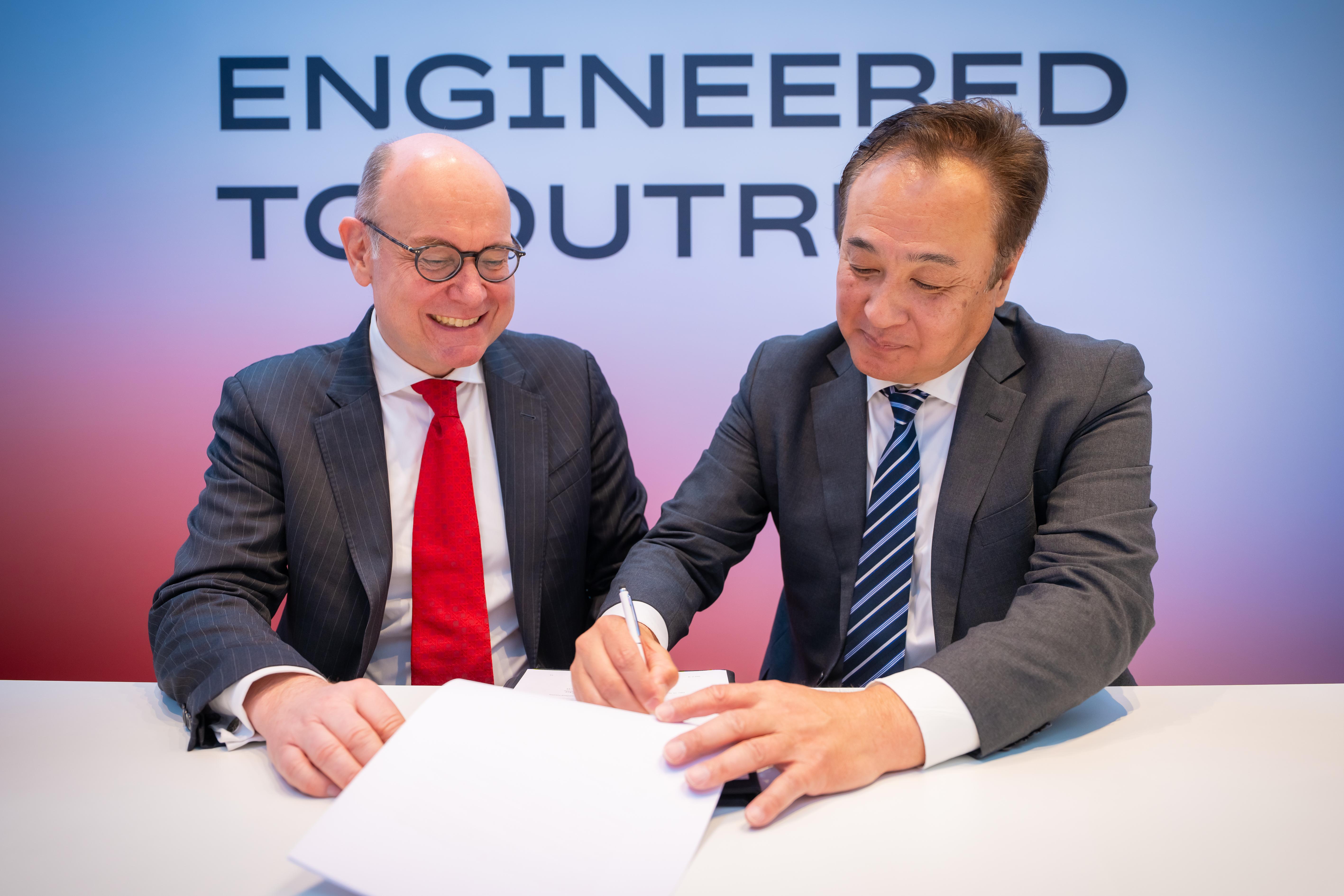 住友商事工程机械与采矿系统战略业务部(SBU)总经理Kenichi Hyuga与ABB过程工业业务全球总裁Joachim Braun在德国慕尼黑bauma展出席协议签署仪式。图片来源:ABB