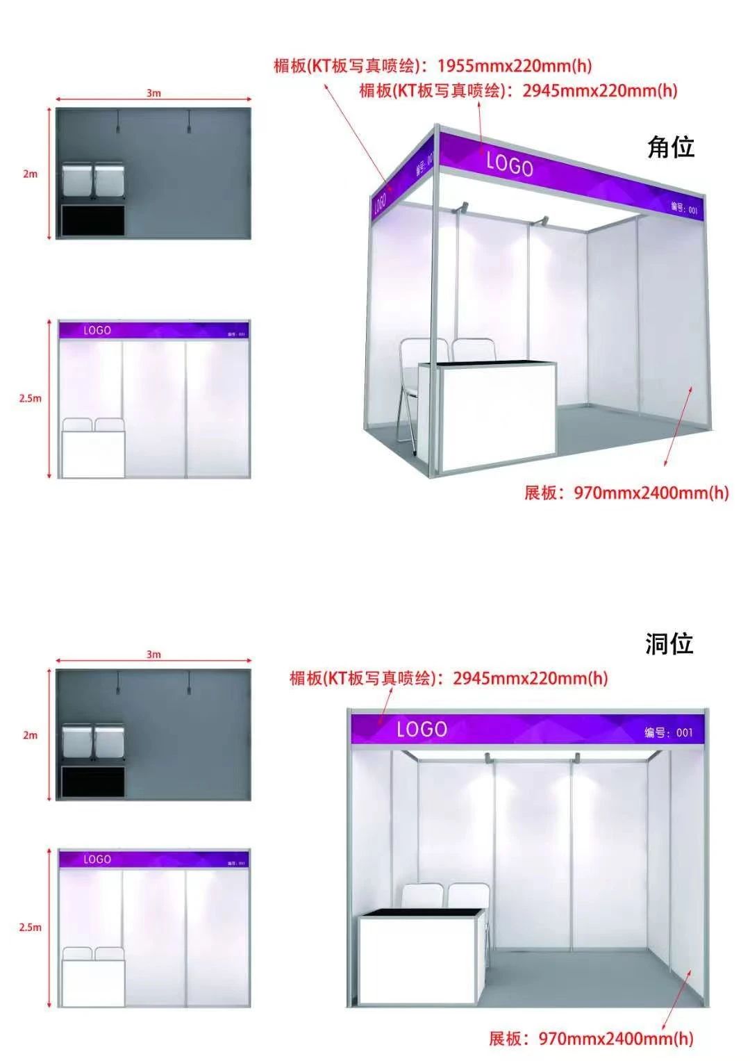 1、提供1个3m(宽)*2m(进深)的标准展位1个(包括1张桌子,2把椅子)