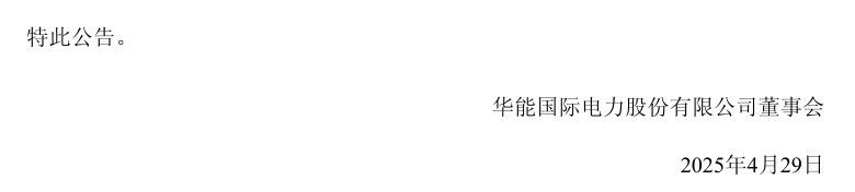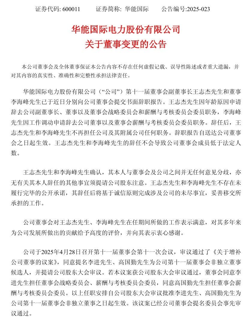2025年4月29日,华能国际公告,第十一届董事会副董事长王志杰先生和董事李海峰先生已于近日分别向公司董事会提交书面辞职报告。