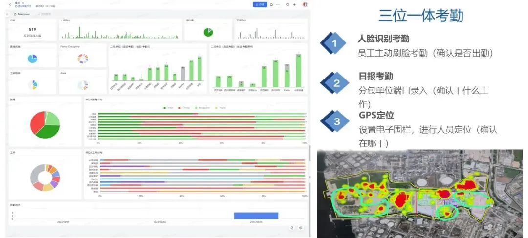 面对工艺复杂、交叉作业密集等挑战,项目部创新打造“数字孪生”管理体系,开创海外工程建设的新范式。项目团队突破传统管理模式桎梏,自主研发搭建信息化管理平台。通过大数据分析优化施工作业,实现对五千余作业人员、数百台机械设备和数万吨材料的全周期动态管控。