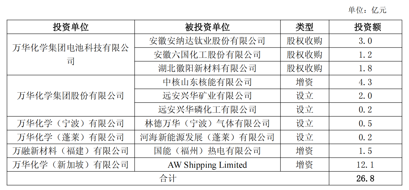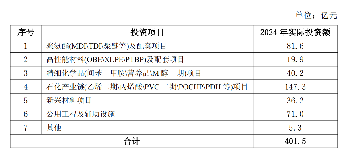 2024年实际完成项目投资401.5亿元,主要投资完成情况:聚氨酯及配套项目完成投资81.6亿元,高性能材料及配套项目完成投资19.9亿元,精细化学品项目完成投资40.2亿元,石化产业链项目完成投资147.3亿元,新兴材料项目完成投资36.2亿元,公用工程及辅助设施完成投资71.0亿元,其他项目完成投资5.3亿元。具体投资完成情况如下: