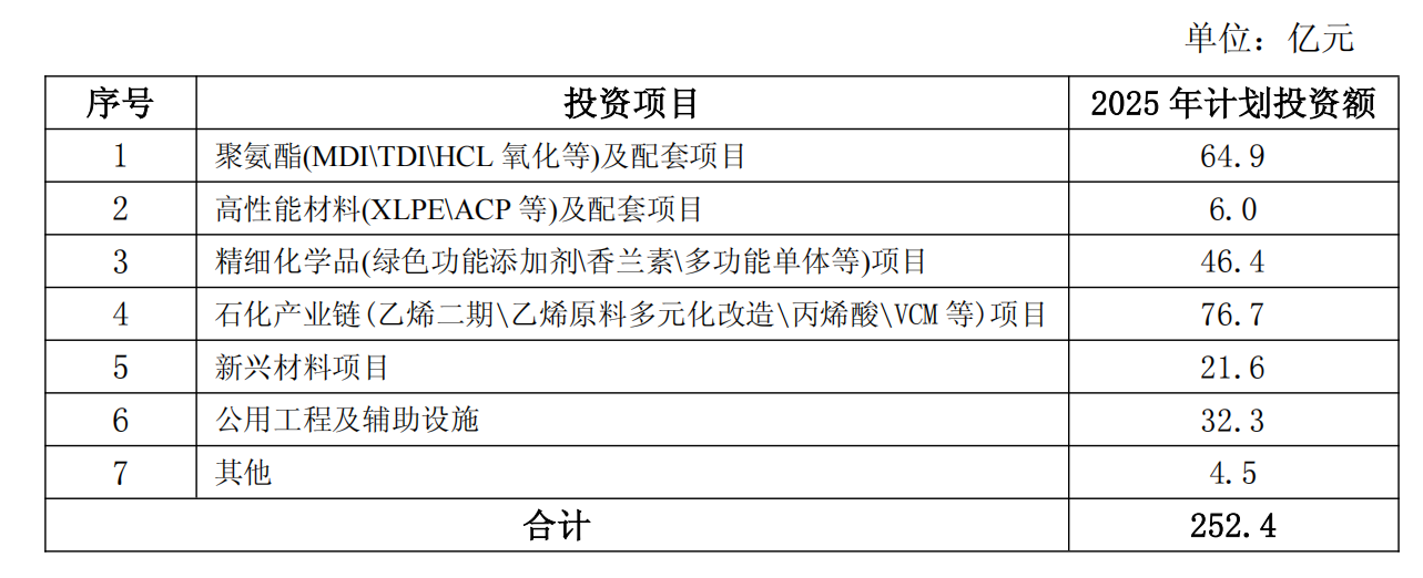 2025年主要项目计划投资252.4亿元。重点建设MDI扩能一体化配套项目,全年聚氨酯及配套项目计划投资64.9亿元;完善石化产业链,重点完成100万吨/年乙烯原料多元化技改及乙烯二期项目建设,全年石化产业链计划投资76.7亿元。加快自主研发的绿色功能添加剂、香兰素、营养品等一系列营养科技产品的工业化建设,全年精细化学品项目计划投资46.4亿元;持续打造公司第二增长曲线,加快磷酸铁锂、PVDF等一系列电池材料等项目建设,全年新兴材料项目计划投资21.6亿元。具体项目投资计划如下: