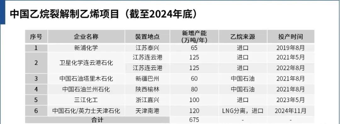截至2024年底,中国已有6个乙烷裂解制乙烯项目共计7套装置建成投产,涉及乙烯产能675万吨/年,占国内乙烯总产能的13%。其中,以进口乙烷为原料的项目有4个,涉及产能535万吨/年;以国产乙烷为原料的项目有2个,涉及产能140万吨/年。根据数据显示,2024年中国从美国进口液化乙烷553万吨,进口依存度达到98%。