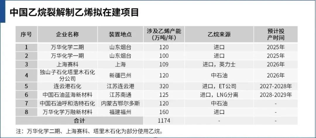 据不完全统计,目前国内规划建设或改造的采用乙烷进料或乙烷、轻烃、石脑油混合进料的项目有8个,涉及产能超过1000万吨/年。2025年中国从美国进口的乙烷量有望迎来爆发式增长。根据预测,2025年中国的乙烷进口量预计将达到630万吨至820万吨,增幅在9%至34%之间。
