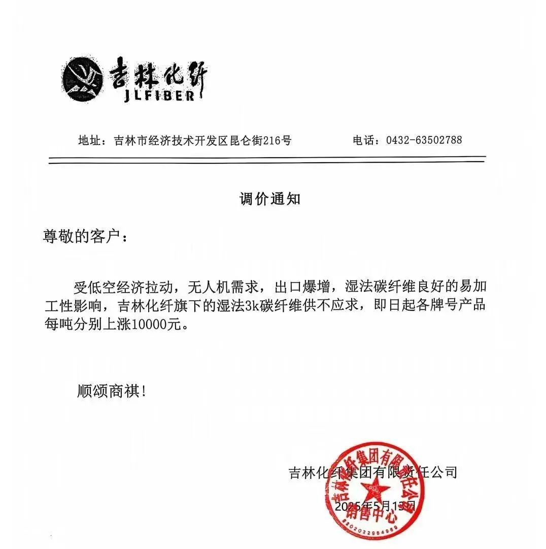 比如前不久吉林化纤发布调价通知:受低空经济拉动,无人机需求,出口爆增,湿法碳纤维良好的易加工性影响,吉林化纤旗下的湿法3k碳纤维供不应求,即日起各牌号产品每吨分别上涨10000元。据《科创板日报》5月14日讯,吉林化纤董秘办确认了消息的真实性。5月14日,吉林化纤涨停收盘,股价上涨9.92%。5月19日继续涨停!