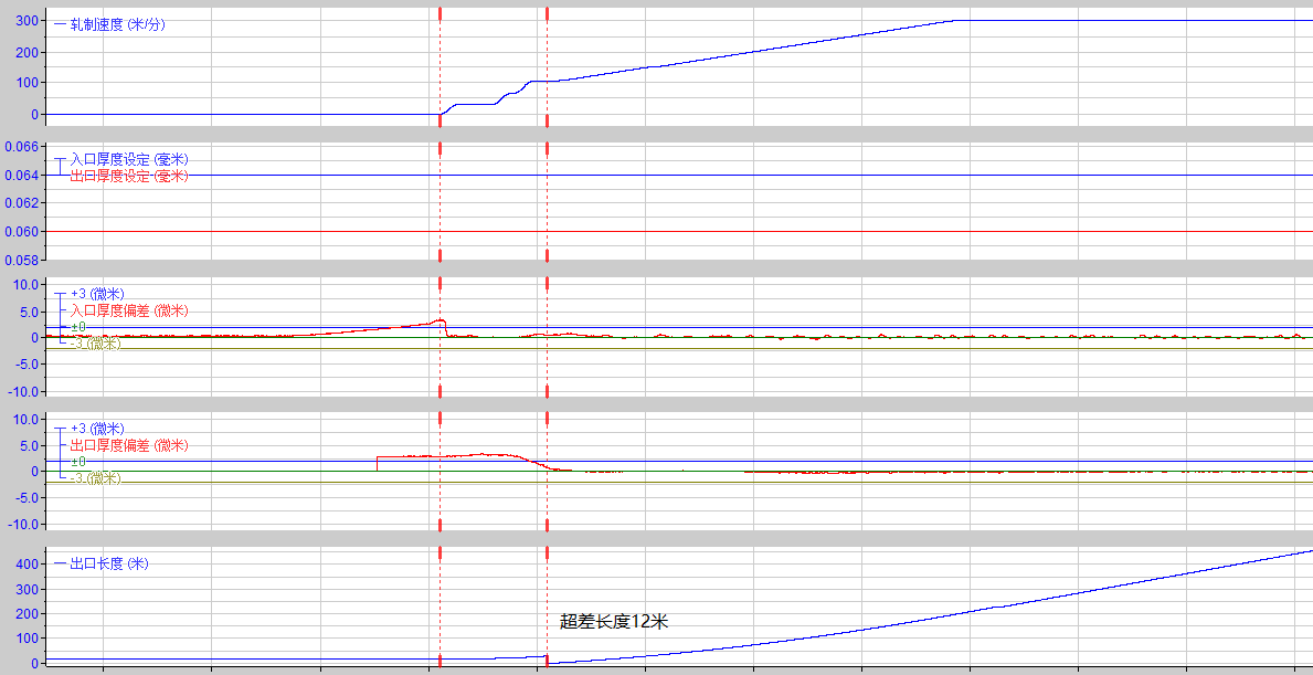 2024年末,ABB在对宁波宝新进行常规回访期间获悉,生产超薄带钢时存在异常的超差长度问题,即厚度波动现象,这一问题在道次开始的升速阶段尤为明显,会对产品的成材率和生产效率造成一定影响。随后,ABB迅速响应,组织团队进行远程会诊,并派遣冷轧专家前往现场进行方案测试与优化。
