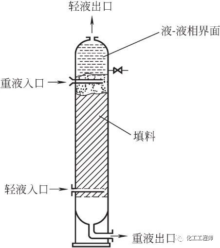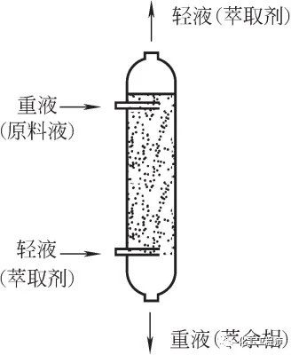 若以重相为分散相,则重相经塔顶的分布装置分散为液滴后进入轻相,与其逆流接触传质,重相液滴降至塔底分离段处聚合形成重相液层排出;而轻相上升至塔顶并与重相分离后排出。若以轻相为分散相,则轻相经塔底的分布装置分散为液滴后进入连续的重相,与重相进行逆流接触传质,轻相升至塔顶分离段处聚合形成轻液层排出,重相流至塔底与轻相分离后排出。