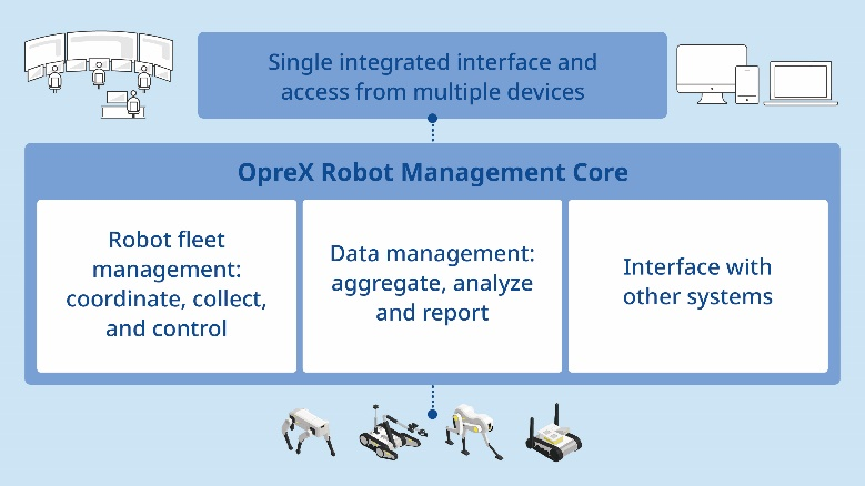 OpreX机器人管理核心平台是横河电机机器人解决方案中的关键产品。该软件通过整合管理各类用于执行工厂维护任务(原本通常由人工完成)的机器人,帮助客户更安全、高效地维护设施。当该平台与工厂的控制和安全系统连接后, 所获取的数据可用于向机器人发出指令,从而迈出实现工厂自主运营的重要一步。引入壳牌ORE技术后,OpreX机器人管理核心平台能为客户提供的应用场景将显著增多。