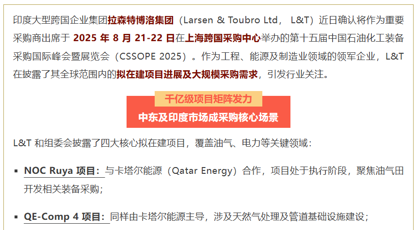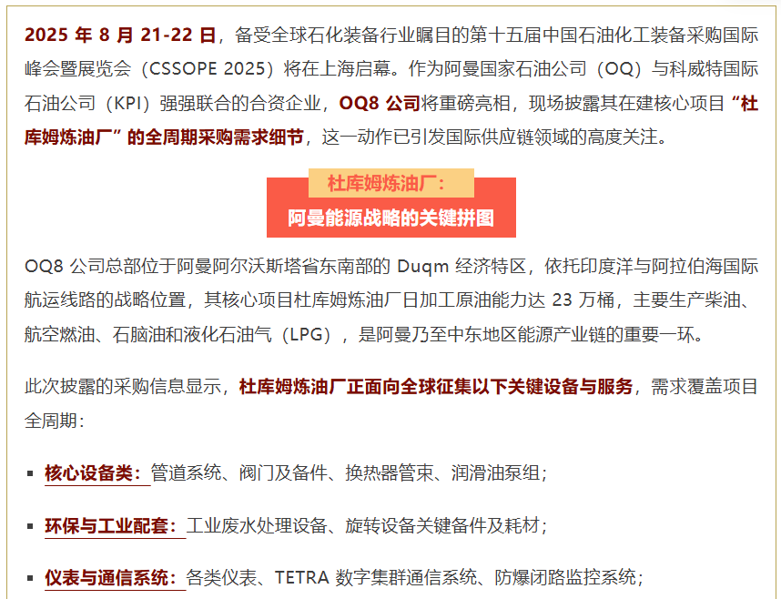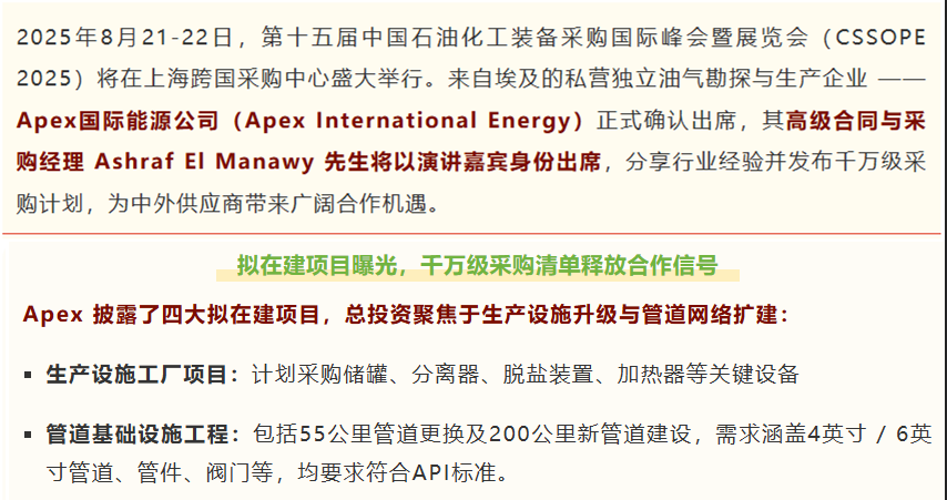 2025年8月21 - 22日,第十五届中国石油化工装备采购国际峰会暨展览会(CSSOPE 2025)将在上海跨国采购中心盛大举办。这不仅是油气化工行业一年一度的采购盛会,更是中国供应商扩大国际“朋友圈”、对接国际买家的黄金契机。
