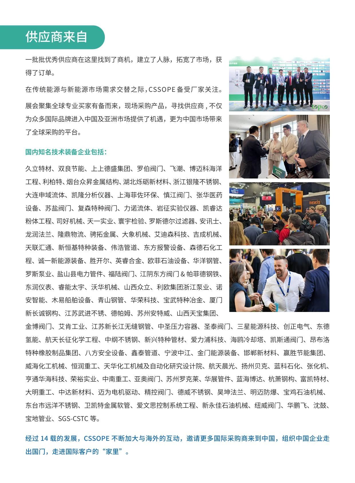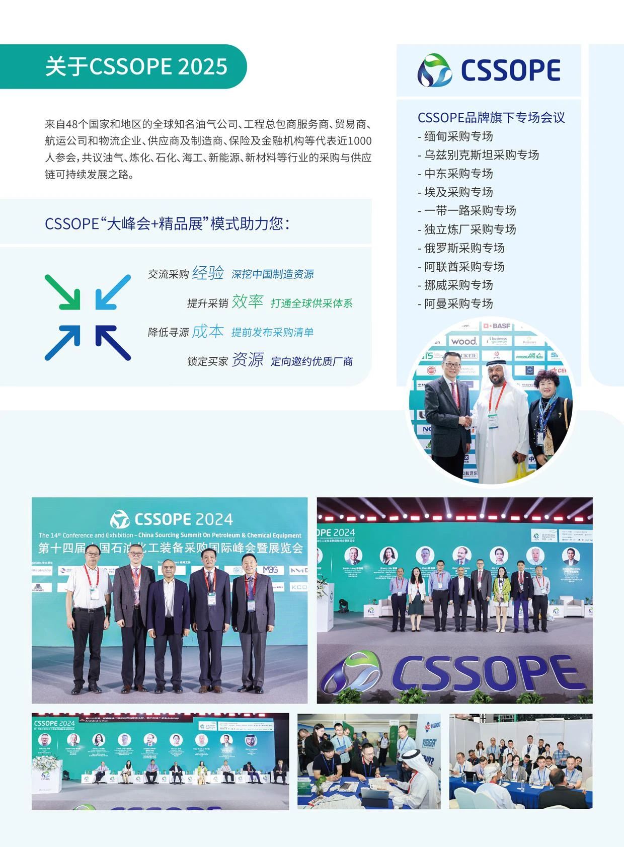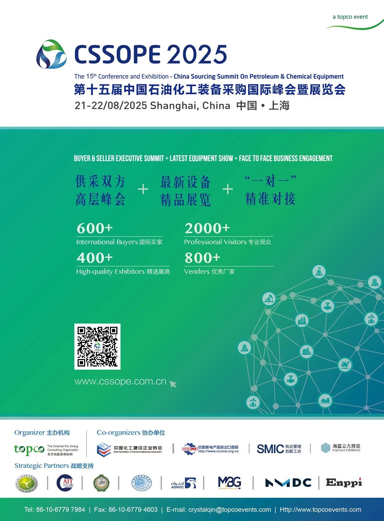 CSSOPE 2025是中国供应商不容错过的国际盛会。在这里,您将找到扩大国际“朋友圈”的最佳捷径,开启国际业务拓展的新篇章。诚邀广大中国供应商踊跃报名参与,共赴这场行业盛宴,携手共创石化装备行业国际合作的美好未来!
