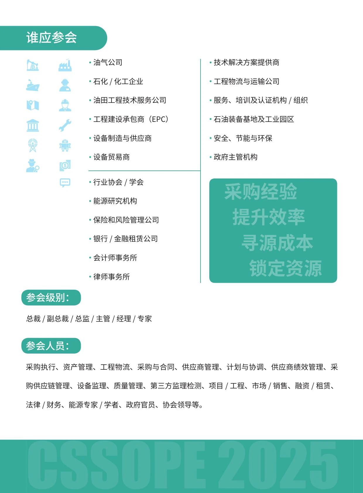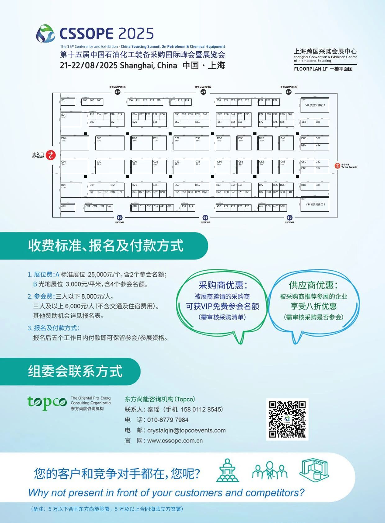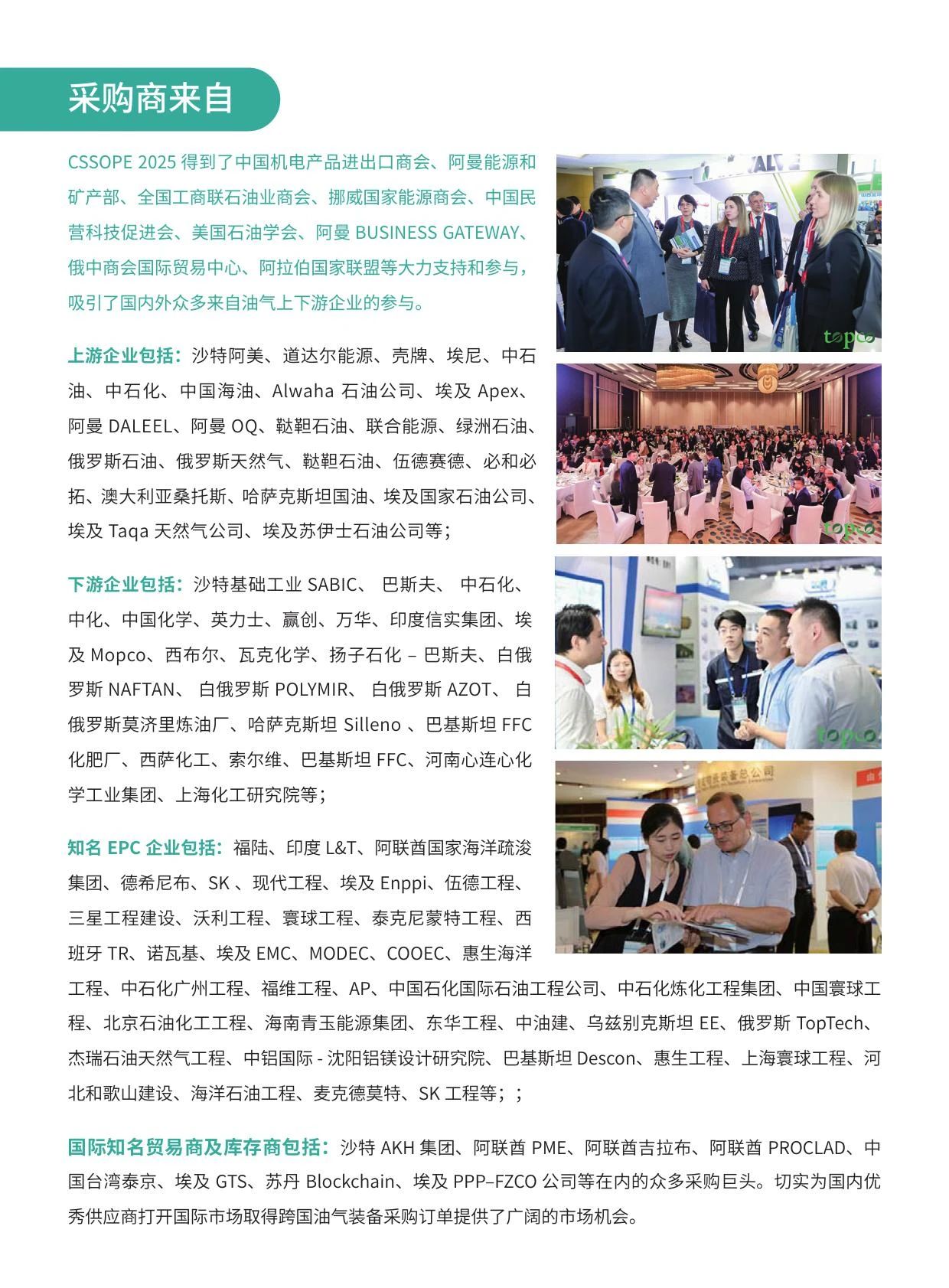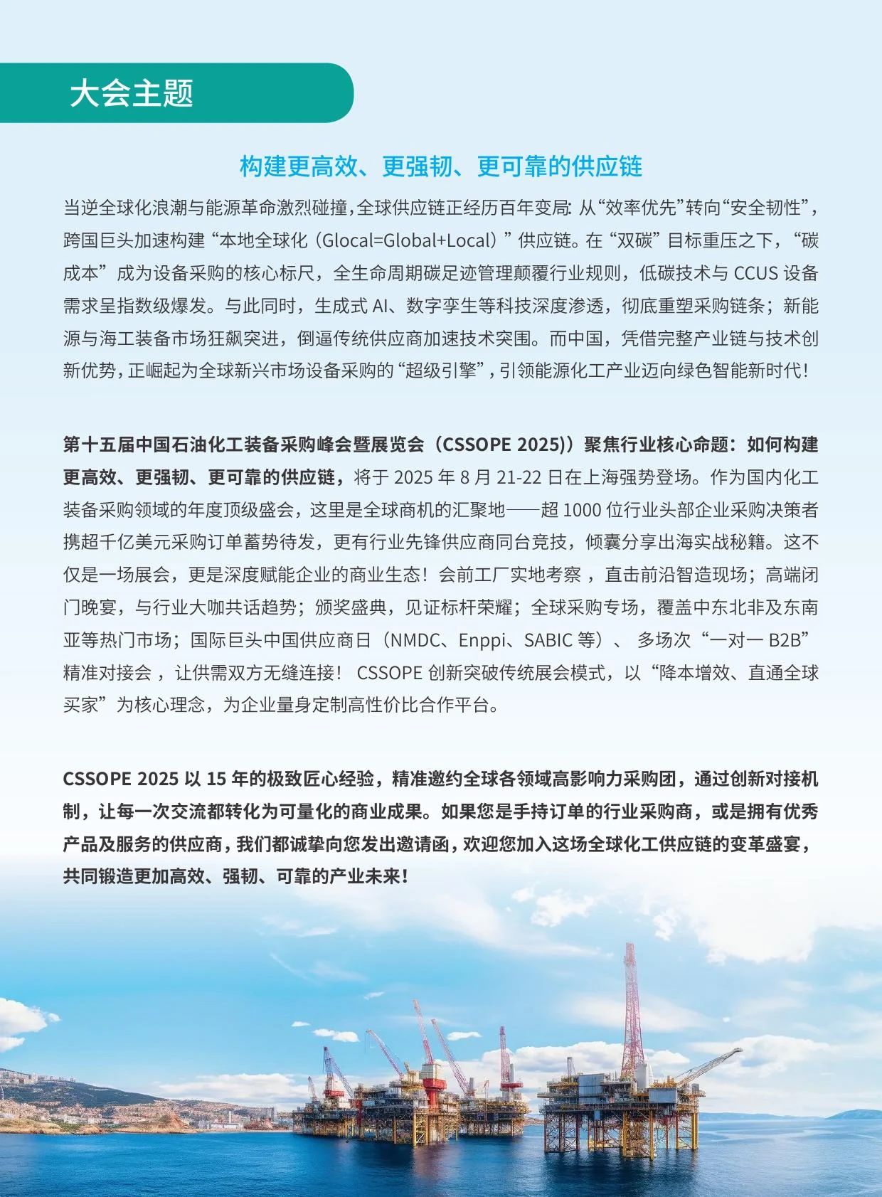 CSSOPE 2025是中国供应商不容错过的国际盛会。在这里,您将找到扩大国际“朋友圈”的最佳捷径,开启国际业务拓展的新篇章。诚邀广大中国供应商踊跃报名参与,共赴这场行业盛宴,携手共创石化装备行业国际合作的美好未来!
