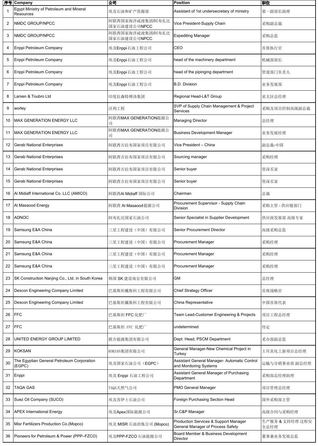•埃及苏伊士石油公司(Suez Oil Company (SUCO)):国外采购部主管Youssef Elgohary将作为演讲嘉宾出席。