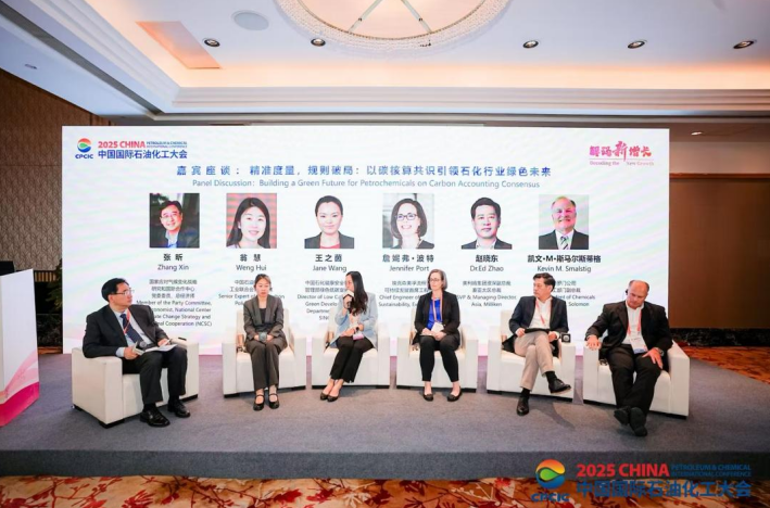 论坛最后,由张昕主持,翁慧、王之茵、詹妮弗·波特女士以及美利肯集团资深副总裁兼亚太区总裁赵晓东和所罗门公司化工部门副总裁凯文·M·斯马尔斯蒂格先生五位嘉宾共同围绕“以核算精准化推动减排最优化:石化行业碳管理新篇章”展开座谈。大家一致认为需平衡行业精细化管理与核算可操作性,加强国际协作与人才培养,为石化化工行业绿色转型筑牢核算基石。