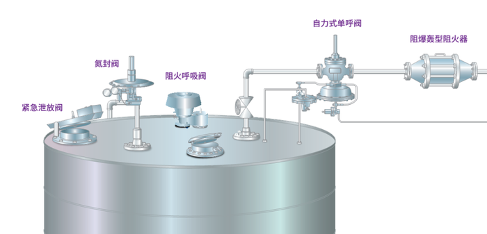 在一些应用中,自力式单呼阀用于在储罐液位上升或温度升高时泄放压力,将蒸发气送至蒸发气控制系统,如火炬、洗涤器或VOCs回收系统。