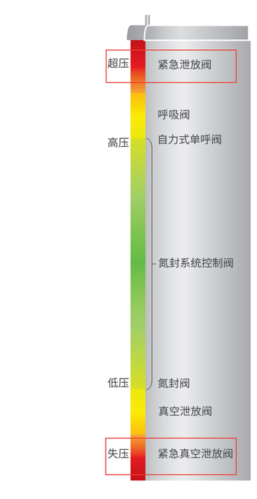 储罐压力控制系统包括了多级保护,由于液位和温度的变化而引起的罐内正常压力的变化是由压力真空泄放阀、氮封阀和自力式单呼阀进行控制。紧急泄放口可以防止火灾或系统故障产生的异常压力或真空。在这种情况下,为了保证安全,保护储罐设备,需要迅速地消除过大的正负压。