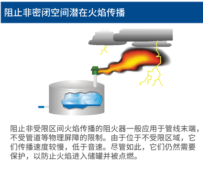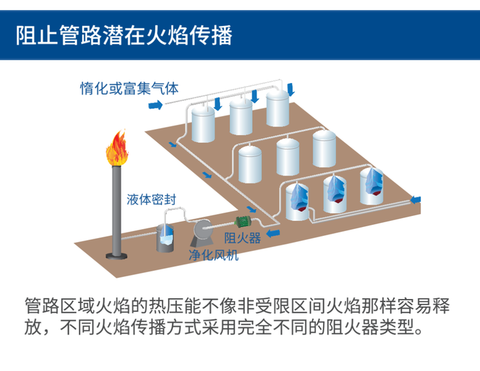 阻火器最典型的应用是,防止大气中的火焰进入一个封闭的空间。当受雷电的影响,气体从泄放口外泄时,阻火器可防止储罐爆炸。另外一种则是管道阻火器,也称为防爆燃和防爆轰型阻火器。(非技术性地说,爆燃系指快速燃烧,而爆轰系指爆炸。)混合气体万一具备了被点燃的条件,系统内部或外部就会产生火焰,造成灾难性的损失。在管道中安装这些装置,可防止火焰通过。
