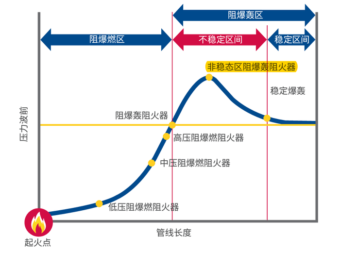确定火焰传播转变为稳定爆轰的位置是不可预测的,因为涉及到许多变量。因此,建议仅在爆轰阻火器应用中使用非稳态爆轰型阻火器。