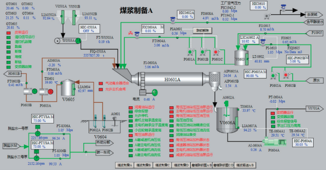 煤浆制备系统A(见图2)负责将煤和水混合成煤浆,并将其输送至煤气化反应器。系统包括多个子系统和设备,以确保煤浆的高效制备和输送。主要组件包括用于处理和输送煤的装置(GT0601至GT0606)、储料罐(V0501A和V0501B)、液位传感器(LIA0502A和LIA0502B)、称重装置(W0503A)、混合罐(V0605)、混合泵(P0603A和P0603B)、进料管道(A1060A)、加热装置(H0601A)和流量控制器(FIC0604A)。系统通过各类传感器实时监测系统内的温度、压力、流量和液位,确保操作的安全性和稳定性。煤浆制备系统A通过高效的混合泵和加热装置,实现了煤和水的充分混合和加热,提高了煤浆的流动性和反应效率。
