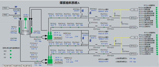 煤浆给料系统A(见图1)负责将煤浆从储存罐输送至反应器。该系统包括多个关键组件,如煤浆罐(V0701A)用于储存和混合煤浆,液位传感器(LIA0701A)和压力传感器(PIA0701A1)监测罐内参数。进料阀(HV0750B2和HV0750A1)控制煤浆的进入,煤浆泵(P0701A1和P0701A2)则负责将煤浆输送到不同的反应器。分配阀(XV0701A1至XV0701A4)和流量传感器(FIA0701A1至FIA0701A4)共同作用,确保煤浆的精确流动和分配。系统还配备了温度传感器(TI0701A1和TI0702A1)和压力传感器,以实时监测和调整操作条件,确保高效、安全的煤气化过程。流量累计器(FZT0701A1至FZT0701A4)记录煤浆总流量,状态指示灯显示各部分运行状态,通过这些监控和控制手段,系统能及时发现并解决运行中的问题,提升系统的可靠性和安全性。