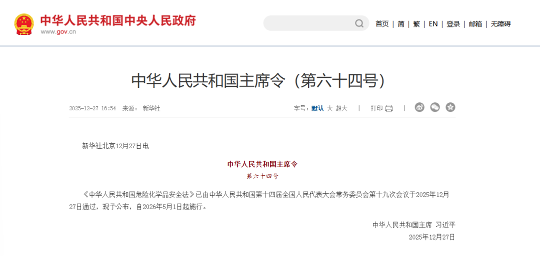 《中华人民共和国危险化学品安全法》即将正式取代现行的《危险化学品安全管理条例》,此法规的发布标志着我国危险化学品安全管理进入主动风险防控和社会共治为核心的新阶段。法规将于2026年5月1日正式施行。