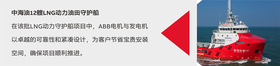 ABB电机与发电机凭借超百年的深厚经验与前沿创新科技,为船舶行业注入强劲动力,助力行业迈向高效、智能、可持续发展的新阶段。每一个项目,都是我们与客户携手共创的成果,每一次合作,都彰显了ABB对卓越品质与绿色发展的不懈追求。